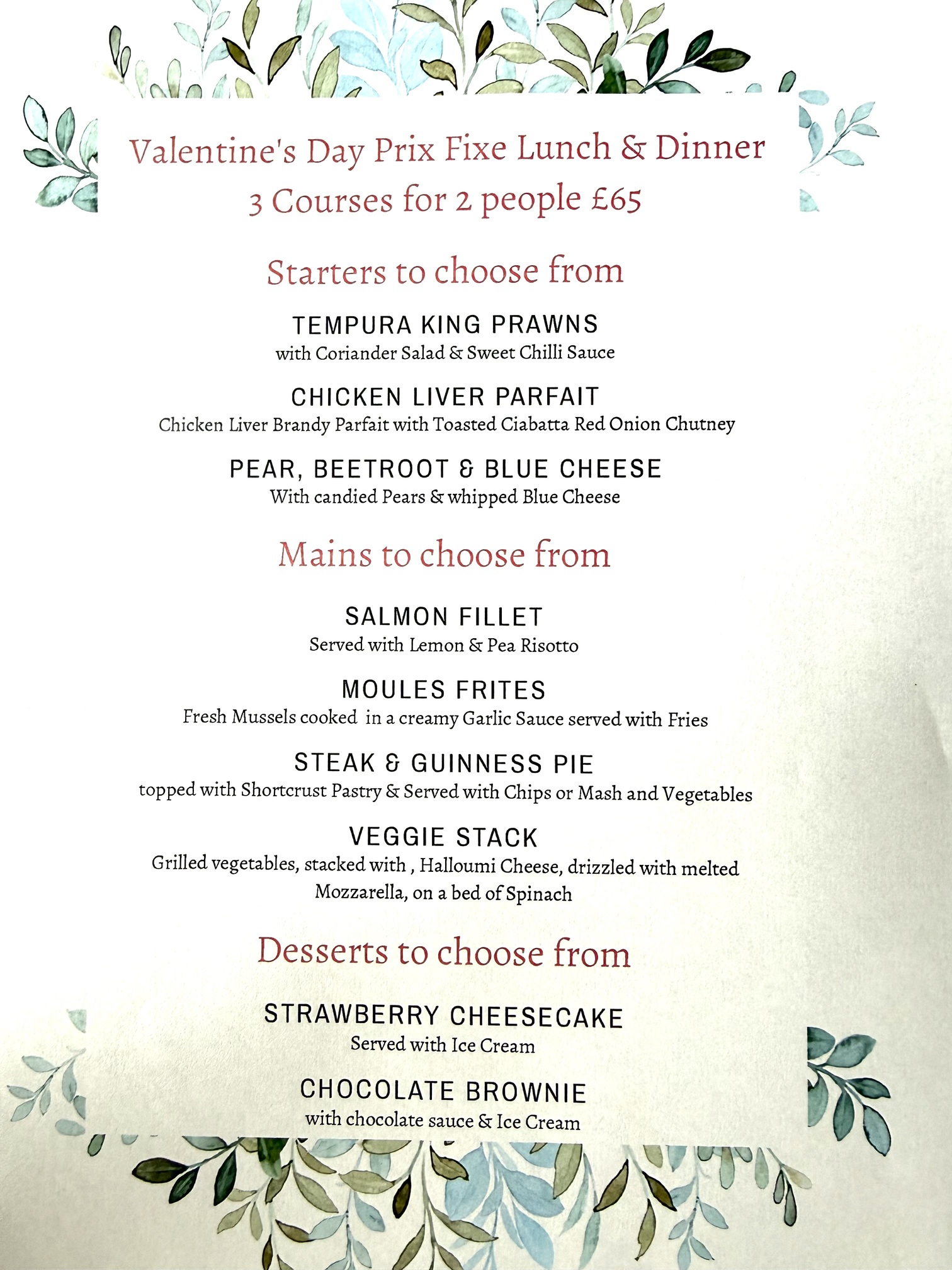 Enjoy a delicious 3-course Valentine’s menu for 2 people at just £65, featuring carefully crafted dishes, indulgent flavours, and the perfect balance of savoury and sweet. From tempting starters to a memorable main and a delightful dessert, it’s the ideal choice for a special date night. 🍷✨